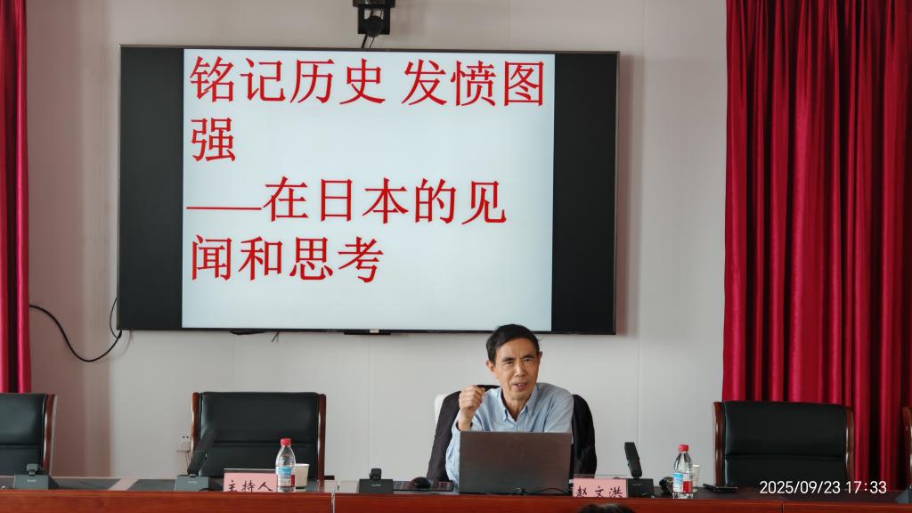 赵文洪教授以《铭记历史 发愤图强》为题,以其深厚的学术造诣和丰富的研究经验,立足于宏阔的历史视野,通过大量珍贵的历史文物图片、文献资料和遗迹影像,回溯了近代以来中华民族所经历的艰难曲折与深重苦难,结合其对战后国际关系与历史认知的长期观察,分析了对待历史的不同态度对国家发展与民族未来的深远影响,强调:历史是最好的教科书,也是最好的清醒剂。铭记近代中国落后挨打、任人欺凌的惨痛教训,并非为了延续仇恨,而是为了深刻汲取“落后就要挨打”的历史启示,激发自强不息的民族精神,凝聚团结奋斗的磅礴力量。他勉励广大教师,尤其思政课教师作为马克思主义理论的学习者、研究者、传播者,更要知史爱党、知史爱国,从历史的苦难辉煌中汲取智慧和力量,将悲愤之情转化为奋发向上的实际行动。
